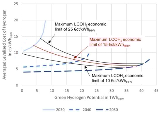 Techno-economic analysis procedure: First of all, the LCOH2 for each specific possible number of full-load hours of hydrogen, the considered years 2030, 2040 and 2050 as well as three different plant sizes are calculated, based on Equation (4) and Table 2. By using this comprehensive table, the threshold of economic full-load hours for each considered year and plant size, based on maximal LCOH2, was defined. In this work, the maximum LCOH2 economic limit is 15 €ct/kWhHHV, based on hydrogen’s cost competitiveness evaluation in recent literature [60,61,62,63]. In addition, the influence of this value is analysed within the discussion of this work (Section 4.1).