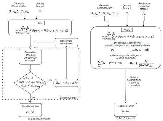 Finally, the UC has to determine which generating units should be used at what hours to satisfy all the requirements at a minimum operating cost, assigning to each unit the power to be delivered at each moment. The basic UC flowchart can be seen in Figure 1. Some authors have incorporated a frequency-secured optimization framework for the procurement of an inertia [33] and frequency response [34], which enables the application of a marginal pricing scheme for these services.