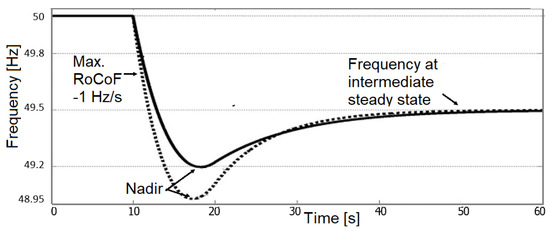 Immediately after the contingency, in the first interval (up to ), the behavior of the system is inertial, and the frequency variation only depends on the contingency ) and the system inertia ). Therefore,