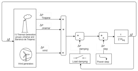 It is possible to observe the three most singular points in the described curve (characteristic points of a second-order response underdamped): the initial slope (RoCoF), the value of the greatest overshoot (nadir frequency), and the stabilization value (steady state frequency). With respect to the electrical system of Gran Canaria, the limit criterion for the RoCoF is set at −1 Hz/s, and the minimum nadir frequency is set at 48.95 Hz [36]; the basic frequency response corresponding to these limits is represented in Figure 2 by the dotted line. The Canary Islands system operator has developed its own tool to analyze the behavior of the post-contingency frequency [37], which is a simplified dynamic model based on a single node and with the governors modeled as first-order linear systems. In this research, a new tool developed in MATLAB/Simulink [38] has been used to verify the frequency behavior (see Section 2.2, Section 4.1, and Section 4.2), in which the electrical system of Gran Canaria has been modeled as a single node because it is intended to evaluate the evolution of the average system frequency, in other words, the center of inertia (COI). The system model (Figure 3) includes individual models created for each of the conventional thermal generators: two combined cycles, two gas units, and two steam units in Barranco de Tirajana; and two diesel generators, three gas units, and two steam units in Jinamar. In addition, load damping of 1% is included to represent the demand behavior [37]. The PFR of each generator is given by the Equation (31) as follows, where K is the gain of the regulator (the droop inverse value), is the time constant of the primary regulator, is the generator power output change in per unit at a present time n, and the frequency and the power output of the generator at the immediately previous instant are and , respectively:
