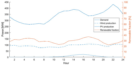 Case 2 demand, wind and PV production, and renewable fraction.