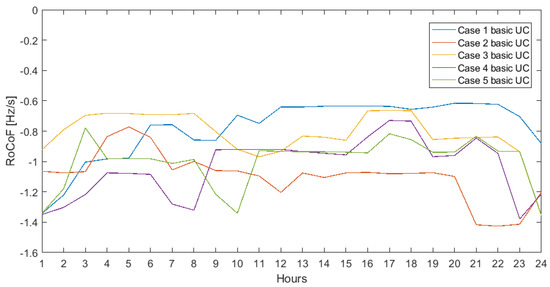 24-h RoCoF for five cases applying bUC.