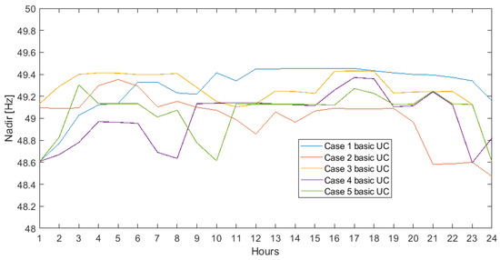 Furthermore, the worst nadir fall values ranged from 48.61 Hz in Case 1 (hour 1) up to 48.47 Hz in Case 2 (hour 24), representing a risk to the system. In all cases, there were some hours within which the RoCoF exceeded −1 Hz/s, and the nadir frequency fell below 49.85 Hz (Figure 5 and Figure 6).