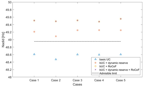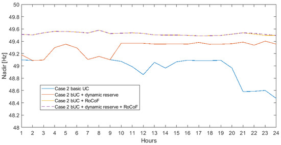 Regarding the arrest of a post-contingency frequency fall, two constraints have been considered: the first is applied on the dynamic reserve allocation, and the second is applied on the RoCoF. Both post-contingency frequency measurements, nadir and RoCoF, are enhanced by including either one constraint, the other, or both. In Figure 7 and Figure 8, the results of the FCUC for Case 2 (the case with the largest renewable fraction) with the incorporation of the RoCoF and dynamic reserve constraints to the bUC problem are shown.