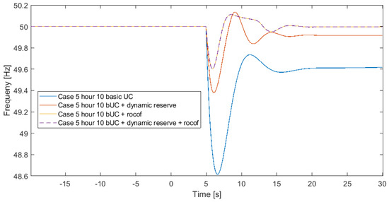 Case 5 at hour 10, post-contingency frequency behavior.