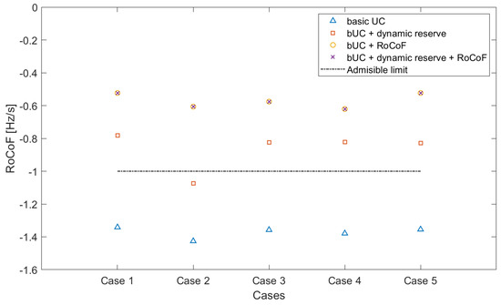 When the bUC was simulated in the case of contingency, the worst post-contingency RoCoF values went from −1.34 Hz/s in Case 1 (hour 1) up to −1.43 Hz/s in Case 2 (hour 22), as shown in Figure 5 and Figure 6, according to the scenario with the highest proportion of renewables and the time when there was a greater increase in demand.