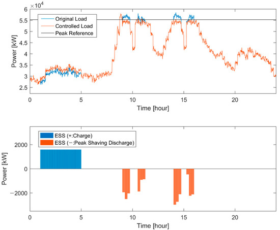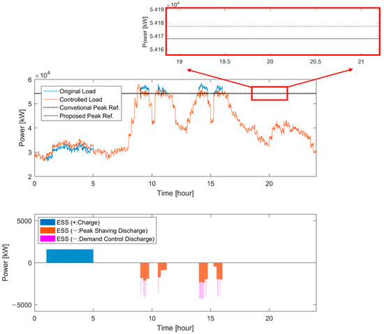 Figure 9 shows an example of the simultaneous operation of peak shaving and maximum demand control. The customer’s load and ESS specification are identical to the case in Figure 2, although the proposed DSM algorithm is added. The proposed peak reference for peak shaving is established as 54,169 kW, for a decrease of 8 kW from the conventional peak reference, 54,177 kW. That result indicates additional ESS discharges for maximum demand control during several 15-min periods while ESS is discharged for peak shaving (i.e., 9:00–12:00 and 14:00–17:00).