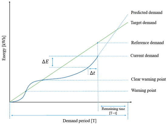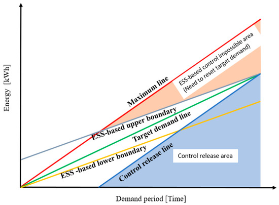 The ESS-based maximum demand control has suggested operational areas and boundaries for ESS operation as illustrated in Figure 4 [32]. The maximum line indicates a limitation of the switchgears installed by customers and consequently shows the greatest slope. The ESS-based lower boundary is the line at which the ESS can reduce demand according to its maximal discharge. The ESS-based upper boundary is generated in parallel by the upward movement of the ESS-based lower boundary, meaning that the marginal boundary can be controlled by the ESS. The control release line provides a guideline for the ESS about stopping its discharge; if the current demand reaches the area below the line, then the corresponding 15 min period does not require demand control. It is generated in parallel by the downward movement of the maximum line. However, if the current demand reaches the area below the maximum line and above the ESS-based upper boundary, then the system cannot maintain the current target demand and consequently needs to increase the target.