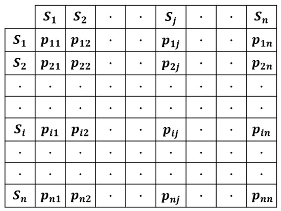 To estimate 1-min load variations within a 15 min period, this study adopted a probabilistic model using an MTM. The MTM indicates the probability of transitioning () from the current state to the next state if a change in state occurs corresponding to time [33]. Figure 5 shows the general MTM; the sum of each row is 1, whereas is a value between 0 and 1.
