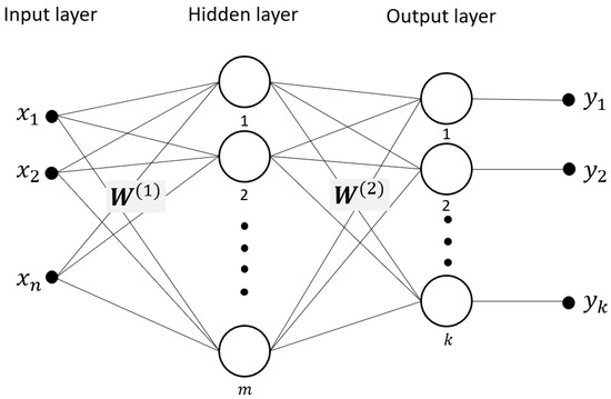 To estimate 1-min variations within the 15-min period, this study also used a feedforward ANN model, in which feed-forward refers to a condition in which the flow is unidirectional, and no feedback between neurons exists [27]. Figure 6 shows a general structure of the ANN model, containing three layers-input, hidden, and output-each composed of neurons. A weighted connection exists between layers, and the input layer comprises input variables. Each neuron in the hidden layer is deformed by the sum of input variables weighted by [34,35], and a hyperbolic tangent sigmoid function is used [27]. The output variables in the output layer are the sum of hidden nodes weighted by . The ANN-based data regarding variability () are calculated as: