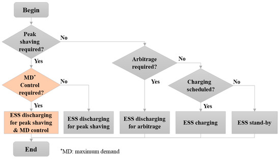 Figure 8 presents a flow-chart of the proposed ESS-based DSM method. Top priority is assigned to ESS-based maximum demand control, which allows simultaneously operating with peak shaving during days with annual peaks higher than the newly established peak reference. The new reference can be aggressively decreased to improve peak shaving’s effect compared with the conventional peak reference, which includes buffers to stabilize control due to the accuracy of load forecasting as introduced in Section 2.2. If those annual peaks can be controlled by the peak shaving operation with the conventional peak reference, then maximum demand control become unnecessary. If annual peaks are not showing, then the ESS performs arbitrage according to daily charging and discharging schedules similar to the conventional ESS-based DSM, as described in Figure 1.