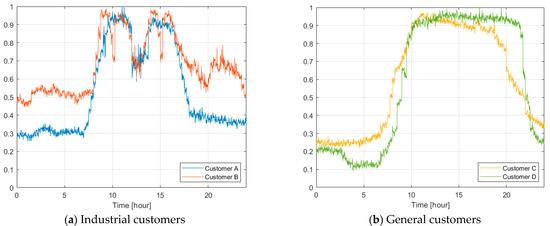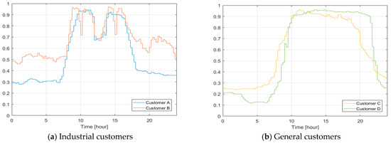 Normalized load profiles of customers at their annual peak day: (a) industrial Customer A and B with an M-shaped pattern, and (b) general Customer C and D with a squared wave-shaped pattern.