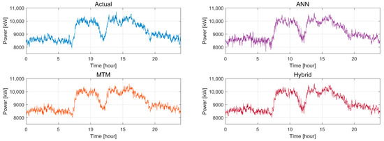 Figure 11 shows daily 1-min load profiles of Customer A estimated by the proposed MTM, ANN, and hybrid models as well as measured load profiles. Because the standard deviation of the estimated 1-min variations of the MTM and ANN models were 0.0110 and 0.0161, respectively, the hybrid model was developed by applying the MTM model, which showed lower variability, to estimate the off-peak loads while applying the ANN model, which showed higher variability, to estimate the on- and mid-peak loads. The standard deviation of the hybrid model was 0.0140, which was the standard deviation closet to the measured data, 0.0134.