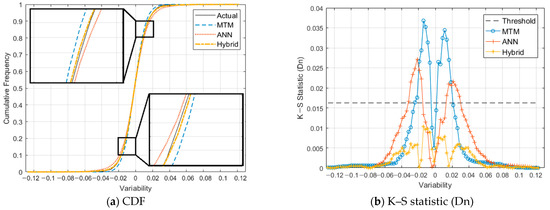 Estimation results of the MTM, ANN, and hybrid models: (a) CDF and (b) K–S statistic (Dn).