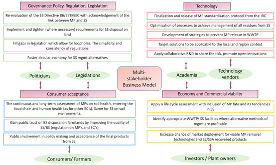 Legislation should reflect the importance of sewage sludge management options that are specific to the local and regional context. It is clear which management solutions have become detrimental in terms of their environmental impact, such as ocean disposal and landfilling. However, the same cannot be said for the opposite. There is no one-size-fits-all solution, instead, solutions should be tailored for the context of a region. Sludge management will depend on the region factors such as type of WWTP, people equivalent, or P content. Therefore, there is plenty of opportunity for innovation and sustainable technology that targets solutions to apply to the local and regional context. For example, optimization of processes to achieve management of all residues/waste streams from sewage sludge, whether that be its use on land, or when incinerated, upcycling residue ash [63]. When focusing on preventative and decentralized solutions for MP release (when it’s not possible to simply implement a ban on the production of MPs), innovations are required in areas such as textile constructions, washing machine filters, guppy bags, and protective coatings. Innovations in decentralized treatments (those focused on removing MP at the WWTP) are also lacking and present an area that needs attention. Overall, all three areas for targeting MP removal (prevention, removal at WWTP, and appropriate management of sewage sludge) present opportunities for sustainable technology. Encouraging collaborative research and development in these areas will share the risk and promote open innovations to continue and increase.