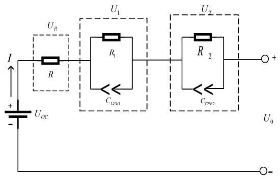 In engineering, the complex chemical reaction mechanism in lithium batteries is often depicted by establishing an equivalent battery circuit model for simplicity’s sake to clarify physical meaning and for online use. The main equivalent circuit models are the Rint, Thevenin, PNGV, and multi-order RC models. However, they all have a common drawback. That is, integer order models cannot depict the charge transfer reaction between the electrolyte and the solid-phase interface layer or the electrochemical process of the electric-double-layer effect. This implies that test results obtained over multiple testing cycles under working conditions severely deviate from the true value. Consequently, in this research, the second order RC model was improved into a fractional order model that can depict the reaction mechanism more realistically. The improved model is shown in Figure 1, where R0 is the ohmic internal resistance of the battery, which reflects its ohmic polarization characteristics; the fractional order links formed by the constant phase elements CPE1 and R1 describe the charge transfer process and the electric-double-layer effect in the battery electrochemical processes; the fractional order links formed by the constant phase elements CPE2 and R2 describe the transfer reaction behavior between the electrolyte and the solid phase interface during the battery electrochemical processes.