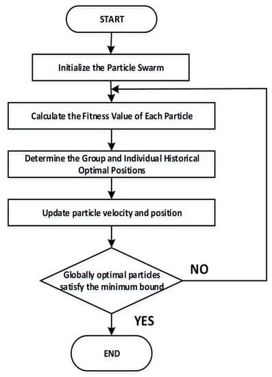 Next, a particle swarm optimization (PSO) algorithm was used to identify the parameters of the fractional order model. The parameters to be identified are . Compared with the integer order model, there are two more capacitor orders. This algorithm is an immediate search algorithm based on group collaboration, which is easier to implement than the other algorithms. The fitness function is continuously optimized by updating the speed and position of particles in the space. When the fitness function is optimal, its position is also at the optimum. The fitness function is the minimum Euclidean norm between the terminal voltage estimated by the fractional order model of the lithium battery, and the actual measured terminal voltage . The process of using the PSO algorithm to identify the capacitor order is illustrated in Figure 3.