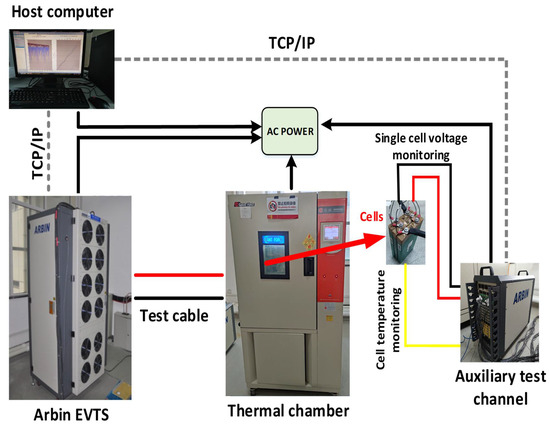 In order to verify the effectiveness of the algorithm proposed in this paper, a lithium battery test platform set was established for this experiment. This platform mainly consisted of the following components: (1) an electric vehicle battery test system (EVTS) produced by Arbin (USA) with a measurement accuracy of , (2) a constant temperature and moisture testing machine produced by Giant Force Company for controlling the ambient temperature of the lithium battery, (3) an upper computer for collecting the lithium battery parameters, (4) a battery pack composed of three ternary lithium batteries. The specific parameters of the battery pack are shown in Table 1, and the physical diagram of the experimental platform is shown in Figure 4. Figure 5 shows the flow of the PSO identification algorithm and the FOUHIF algorithm.