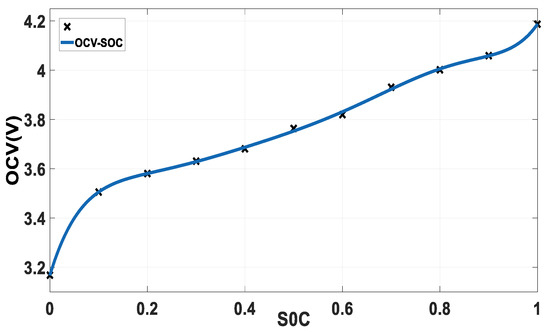 The function relationship between OCV and SOC was calculated before carrying out the parameter identification and SOC estimation. The experimental temperature was set at 25 °C to measure the charge and discharge curves of the lithium battery and to calculate the mean value. Then, by fitting based on Equation (14), the OCV–SOC curve of the battery was obtained, as shown in Figure 6.