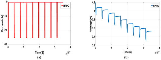 Current and voltage profiles of HPPC cycles, (a) current profiles; (b) voltage profiles.