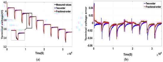 Test results of HPPC cycles. (a) Comparison of terminal voltage estimation results between fractional and integer order models; (b) comparison of terminal voltage estimation error results between fractional and integer order models.