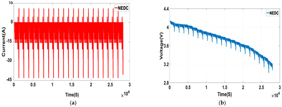 Current and voltage profiles of NEDC cycles; (a) current profiles; (b) voltage profiles.