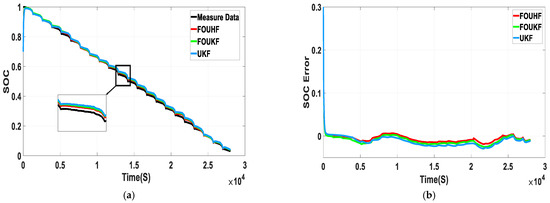 In order to further verify the robustness and universality of the FOUHIF algorithm, lithium batteries were also tested under UDDS working conditions, and an estimation was made on the SOC of the battery by the aforementioned three algorithms. The initial value of SOC was set as 0.5, and the initial error was set as 50%.