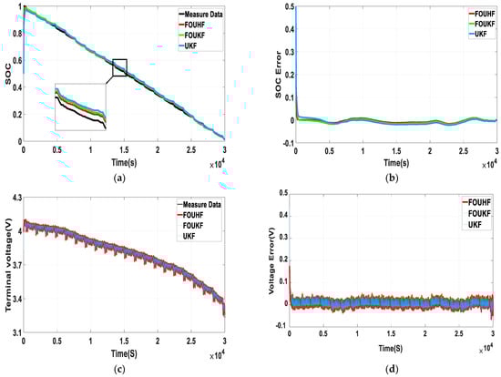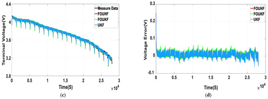 Figure 9a,b show the current and voltage under the NEDC working conditions. Figure 10a illustrates the SOC values of the battery estimated by FOUHIF, FOUKF, and the UKF algorithm, respectively, under the NEDC working conditions. Figure 10b presents the errors in SOC estimated by the three algorithms. As can be observed in these figures, FOUHIF had the highest robustness and greatest estimation effect; the UKF algorithm had the worst estimation effect under these working conditions; and in the FOUHIF algorithm, the root-mean-square error (RSME), mean absolute error (MAE), and maximum absolute error (ME) were reduced to 0.94, 0.78, and 1.86% respectively. Furthermore, the maximum error in the estimated SOC value appears at the 13,686th second. This reflects an improvement in SOC estimation accuracy and improved robustness. Figure 10c demonstrates the terminal voltage values estimated by the three algorithms. The voltage predicted by the three algorithms can track the measured value quickly. However, the maximum absolute error in the terminal voltage predicted by the FOUHIF algorithm was only 5.29 mV. the specific results are shown in Figure 10d. Table 4 shows the SOC estimation errors of the three algorithms under the NEDC condition.
