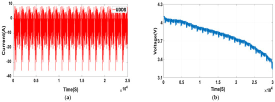 Current and voltage profiles of UDDS cycles; (a) current profiles; (b) voltage profiles.