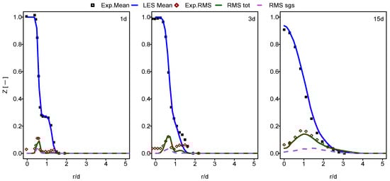 Figure 2. Mixture fraction at different axial positions: comparison for flame D. The dashed line represents the unresolved contribution to the RMS.