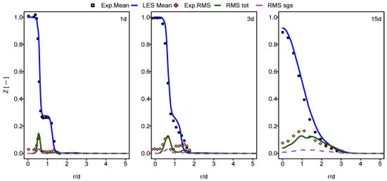 Figure 3. Mixture fraction at different axial positions: comparison for flame E.