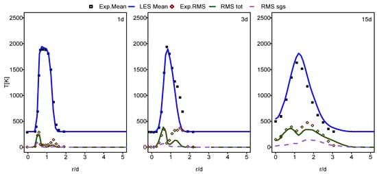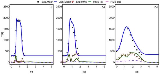 To achieve convergence with respect to stochastic fields, eight stochastic fields are found sufficient, following previous work from the authors [34] on flame D as well as from elsewhere [15,16,17,39]. As stated in Section 2.1.1, the FGM tables were generated by using the Cantera software, taking advantage of the boundary conditions of the Sandia flame series (see Figure 1c and [52]). Simulations were performed using an adjustable time step, ∆t, around 1 × 10 −7 to maintain the CFL number below unity.