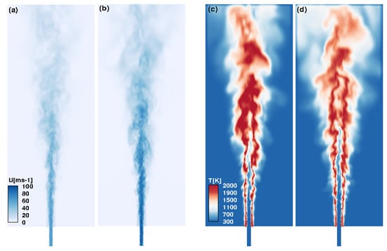 Figure 6. Contour plots of instantaneous axial velocity: (a) Sandia D, (b) Sandia E and instantaneous temperature: (c) Sandia D, (d) Sandia E.