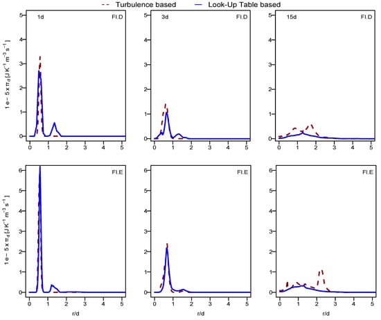 Figure 9. Radial profile of the volumetric entropy from mass diffusion of species: comparison of results using the turbulence-based and the look-up-table-based approaches at various axial positions for flame D (top) and flame E (bottom).