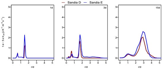 Figure 11. Radial profile of the volumetric entropy caused by viscous dissipation at various axial positions for flame D (red) and flame E (blue).