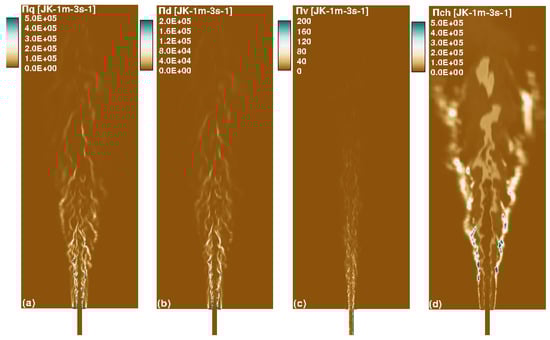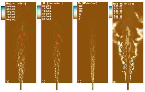 Figure 12. Contour plots of instantaneous volumetric entropy using the look-up-table-based method for flame D caused by: (a) heat transfer, (b) mass diffusion, (c) viscous dissipation and (d) the chemical reaction.