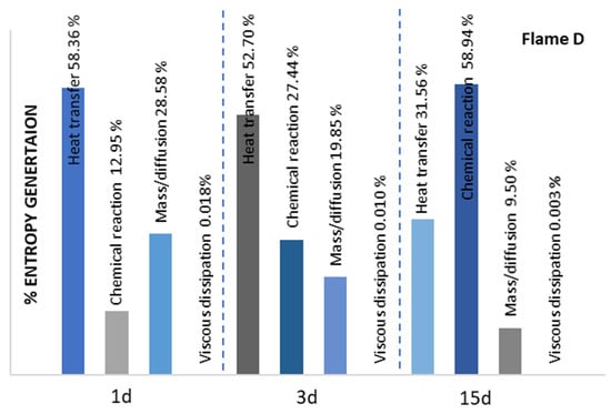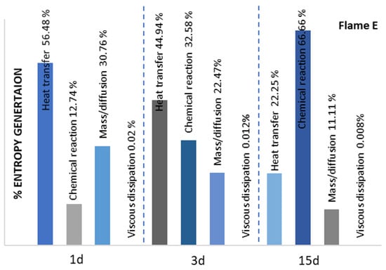 Most energy conversion systems feature, typically, 20–30% of exergy destruction in fuel combustion [1]. In searching for more exergy-efficient combustion, the evaluation of the second law efficiency and subsequent analysis of local entropy generation consisting of minimizing the irreversibilities can be used to optimize the efficiency of current and future systems of energy conversion [1,2,3,4,5]. Previous studies provide reviews of the fundamentals of second-law-based analysis [1,2,3,4,5]. These comprise system-level analysis, commonly called exergy analysis, to calculate the net rate of energy degradation. Thereby, most contributions deal with thermal devices in which viscous and thermal effects for convective heat transfer [3], as well as combined mass and heat transfer phenomena [3], play a significant role. Investigations on entropy analysis in combustion systems are very scarce. Sources of irreversibilites may include heat transfer, mechanical dissipation, mass transfer and diffusion, chemical reactions, phase change, inelastic material deformation and breakup, etc. [1,2,3,4,5,6]. Such irreversibilities lead to a destruction of available energy into internal energy in the system, which causes a raise in the system entropy [1,2,3,4]. This rising of entropy, known as entropy generation/production, results in an abatement of the thermodynamic performance of the system.