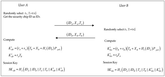 User A with identity IDA and user B with identity IDB can establish the connection and obtain the same session key after finishing the following steps: