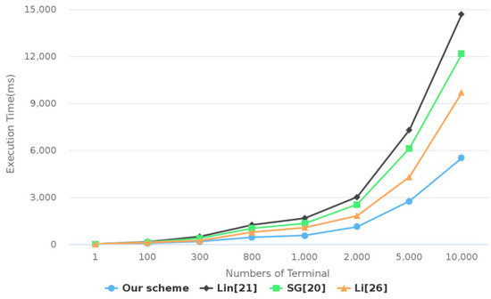 Figure 3 shows the comparison of the execution time in the proposed scheme and schemes [20,21,26]. We calculate the processing time of security gateway by increasing the number of the simulated concurrency from 1 to 10,000. As the authenticated key agreement protocols used in the other three schemes are implemented by the traditional digital certificates, their execution time and computation cost are much greater than our proposed scheme. Conversely, it also shows that the proposed authenticated key agreement has higher efficiency.