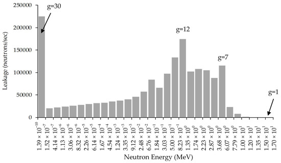 As shown in [6,7,8,9,10,11], the distribution of the PERP leakage in each energy interval is depicted in Figure 1. The value of the total leakage computed using Equation (1) for the PERP benchmark is 1.7648 × 106 neutrons/s.