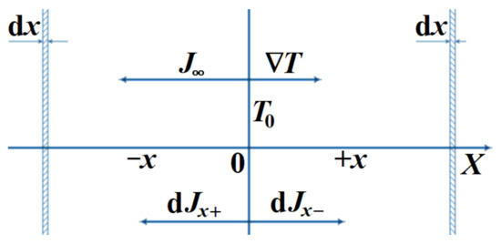 Let us find the heat flux density passing through the plane with the temperature and the coordinate . In this case, the heat flux from the hot side from it does not compensate the flux from the cold side (Figure 2). The heat flux density from layers with a thickness located at a distance from the plane (21) is