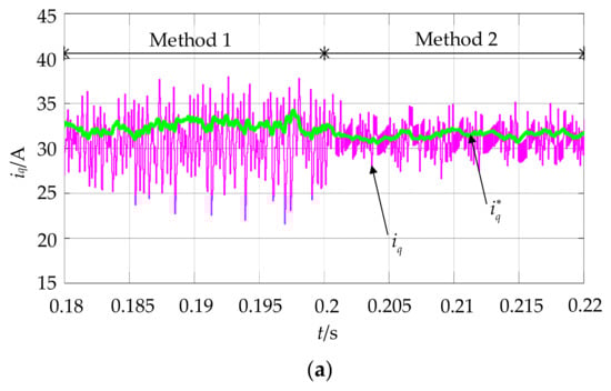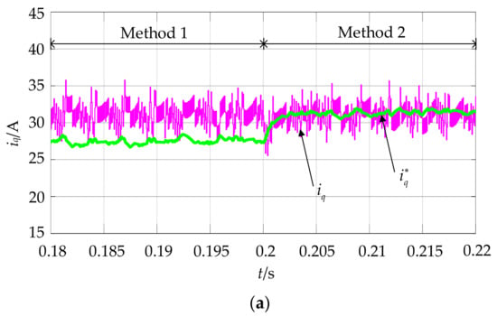 Figure 3 shows the d-axis and q-axis current waveforms of the motor corresponding to the two methods in steady state under resistance mismatch, where . As can be seen from Figure 3, the current control performance of FCS-MPCC is little affected by resistance mismatch because the term related to resistance is much small compared to other terms in Equation (5).