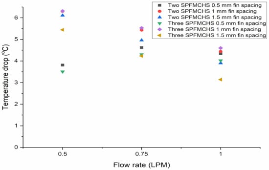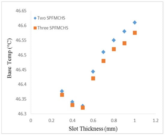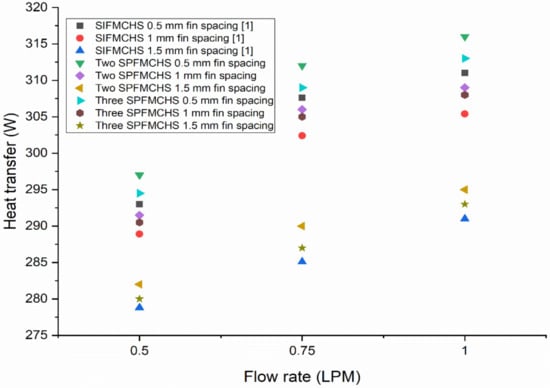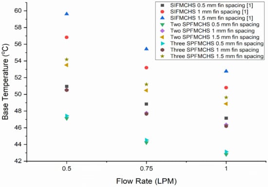- The percentage reduction in the base temperature recorded in three SPFMCHSs with 0.5 mm, 1 mm, and 1.5 mm fin spacings at 1 LPM was 8.53%, 9%, and 5.95%, respectively, when compared to SIFMCHSs.
