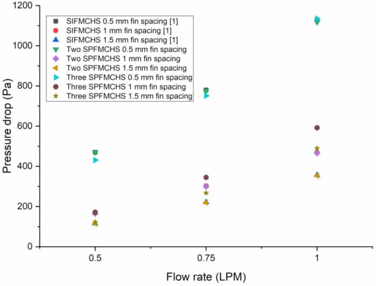 - The percentage reduction in the pressure drop observed for 0.5 mm, 1 mm, and 1.5 mm fin spacings in two SPFMCHSs was 0.64%, 20.68%, and 27.12%, respectively, as compared to SIFMCHSs at 1 LPM. The percentage difference noted in three SPFMCHSs was 1.50%, 21.26%, and 27.93% at 0.5 mm, 1 mm, and 1.5 mm fin spacings, respectively, when compared to SIFMCHS.