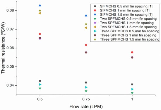 - The reduction in the thermal resistance was observed as 11.24%, 4.48%, and 8.80% in two SPFMCHSs with 0.5 mm, 1 mm, and 1.5 mm fin spacings, respectively, when compared to SIFMCHSs at 1 LPM. The minimum thermal resistance was recorded in two SPFMCHSs with 0.5 mm fin spacing, and the maximum thermal resistance was recorded in SIFMCHSs with 1.5 mm fin spacing.