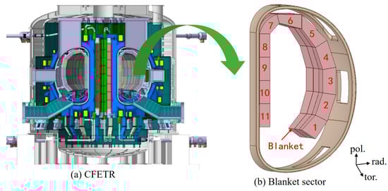 The mission of the Chinese Fusion Engineering Test Reactor (CFETR) is to demonstrate fusion energy production on the basis of ITER’s existing technologies [1]. The blanket surrounding the plasma is an essential component, which should achieve three main functions: reliable shielding performance, sufficient tritium breeding, and efficient heat removal for electricity production. Blanket concepts can be classified into solid and liquid blankets according to the physical form of functional materials [2,3,4]. The liquid blanket relies on the compound or alloy containing lithium as tritium breeder and neutron multiplier, which has inherent advantages, i.e., good geometric adaptability, possibility to bring the breeders out of the blanket for tritium extraction, and higher thermal conductivity, etc. [5]. The family of liquid breeders mainly comprises pure lithium, lead lithium (PbLi), and low melting point ternary Pb-Li-X. Recently, the PbLi eutectic alloy has been widely used because of its much lower chemical reactivity with air and water, which can be used for blanket structure cooling.