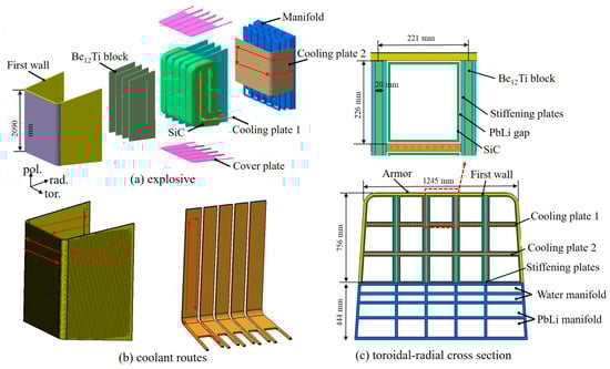 The blanket uses RAFM steel as the structural material, and the main components include the first wall (FW), cooling plates (CPs), stiffening plates (SPs), and cover plates. These components share the same manifolds, which makes water flowing into them in parallel. The FW is a U-shaped structure in which the coolant water passes through the channels along the radial-toroidal direction, and the flowing direction between adjacent channels is set opposite to alleviate the mechanical stress. Moreover, there is a layer of tungsten coating on the FW to protect it from plasma erosion and corrosion. The CPs are designed as an intersecting “7” shape, and it collaborates with the SPs to form the 5 (toroidal) × 3 (radial) PbLi channels. The PbLi flows upwards, then turns into two separate channels, finally converges before the manifolds. To reduce the MHD effects and increase the outlet temperature of PbLi, the SiC layer acting as a thermal and electrical insulator is inserted between PbLi and the structural steel. A gap filling with PbLi between the SiC and structural steel is preserved on purpose, which can avoid structural stress resulting from the direct contact between two different materials. Between the adjacent SPs, Be12Ti blocks are inserted to further enhance the capability of neutron multiplying.