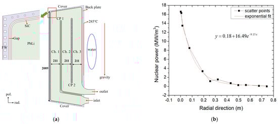 In order to obtain the preliminary thermal hydraulic results for optimization with improved calculation efficiency, a 2D model is developed and adopted for the analysis (Figure 3). This model is a poloidal and radial slice, which is located on the toroidal central plane based on the 3D blanket model. The heat flux from plasma is set as 0.5 MW/m2. The temperature on the backplate is fixed as 285 °C since it directly contacts the inlet manifold containing water. A heat-transfer boundary condition of the third kind derived from Newton’s law of cooling, which includes the bulk temperature of coolant and heat transfer coefficient (HTC), is applied. The bulk temperature in each component and the corresponding HTC values [20,21] used in the calculation are listed in Table 2. The nuclear power distribution along the radial direction is obtained using a 3D MCNP analysis, and the results are normalized to 1.5 GW fusion power. Meanwhile, the power distribution is fitted as a user defined function (UDF) implemented into the FLUENT code, which allows each mesh cell to have a more precise nuclear heating source term. The gravity force is set as the actual operation condition. Besides, the thermal properties of materials are listed in Table 3.