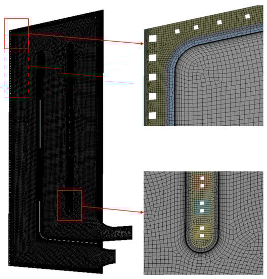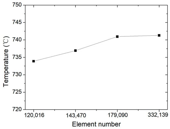 The model uses the mixed structured and unstructured meshes, as shown in Figure 4. By adjusting the mesh size in the solid and fluid domain, mesh independence verification is performed based on the typical thermal hydraulic model (see Section 4.1), as shown in Figure 5. It indicates that the element number of 179,090 is already enough to obtain the precise results, and there is only a temperature increment of 0.35 °C if the element number increases to 332,139. Therefore, the mesh layout with 179,090 elements is adopted for the analyses in this paper. The mesh size of the solid and fluid domains is 2.5 mm and 5.0 mm, respectively. In the boundary layer, the growth rate is 1.4, and there are 18 layers.