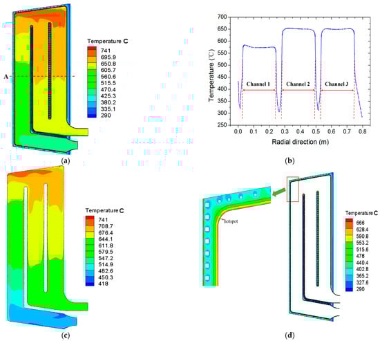 The temperature field of the entire model is shown in Figure 6a. As can be seen, the PbLi entered Channel 1 and is heated continuously to the upper location, where the peak temperature of 741 °C takes place. However, when it splits and then flows into Channel 2 and 3, the temperature decreases rapidly to the average outlet temperature of 612.85 °C. This is because the nuclear heat source in the back zone of the blanket is lower than the front, and CP2 further cools the PbLi. Besides, the inlet channel with a low temperature of 460 °C connects directly with the outlet channel. Heat conduction between the inlet and outlet channels brings additional cooling effects.